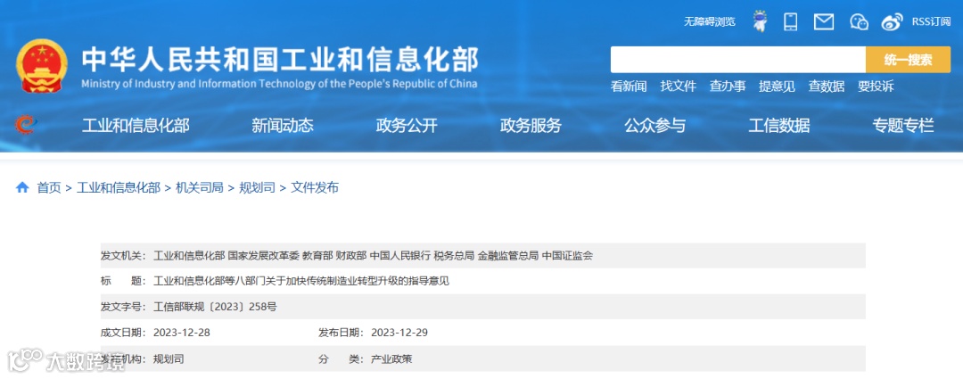 工业和信息化部等八部门关于加快传统制造业转型升级的指导意见。其中提到,推动产业园区和集群整体改造升级。推动国家高新区、科技产业园区等升级数字基础设施,搭建公共服务平台,探索共享制造模式,实施整体数字化改造。以国家先进制造业集群为引领,推动产业集群数字化转型,促进资源在线化、产能柔性化和产业链协同化,提升综合竞争力。探索建设区域人工智能数据处理中心,提供海量数据处理、生成式人工智能工具开发等服务,促进人工智能赋能传统制造业。探索平台化、网络化等组织形式,发展跨物理边界虚拟园区和集群,构建虚实结合的产业数字化新生态。