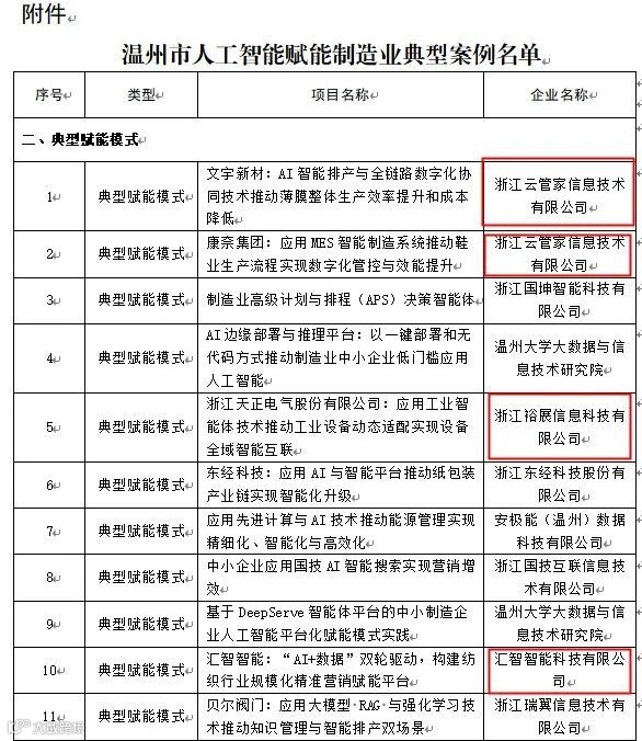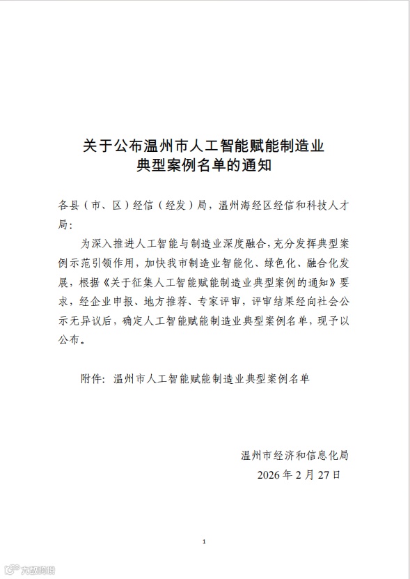 市经济和信息化局正式公布“温州市人工智能赋能制造业典型案例名单”,