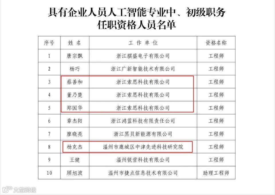 近日,温州首批企业人员人工智能专业职称评审结果揭晓,全市共10人获得初、中级职务任职资格。其中,中国(温州)智能谷入驻企业——浙江索思科技有限公司、温州市鹿城区中津先进科技研究院共有4人入选,展现出智能谷在AI人才培育上的初步成效。