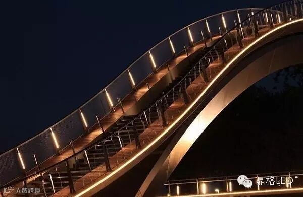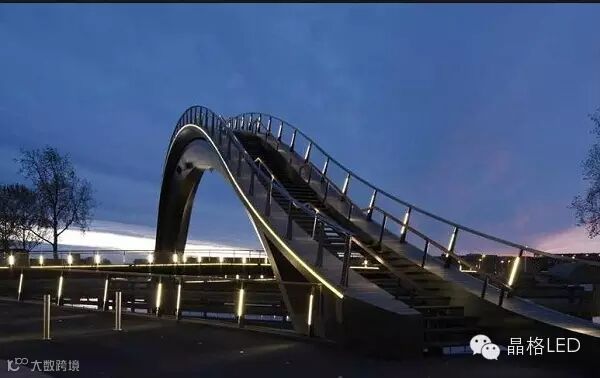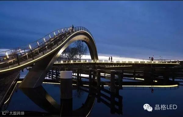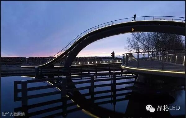 Melkwegbrug,位于荷兰皮尔默伦德,桥梁跨度为66米,其建筑设计为NEXT architects。桥巨大的拱门高度达到12米以上水位,给人们提供了一个令人难以置信的城市景色。登高望风让行人充分体验皮尔默伦德市中心的现在和历史之间的关系。设计师创建了一个较短的路线,为行人提供了一个高的观点。在12米处,拱高到足以让船只通过下方下层分裂成两部分。LED灯线的边缘穿越到天黑后突出两条路线。在桥的边缘LED线应用遵循桥梁轮廓,尤其是日落之后的桥梁,饰以灯光,景色更为壮观。