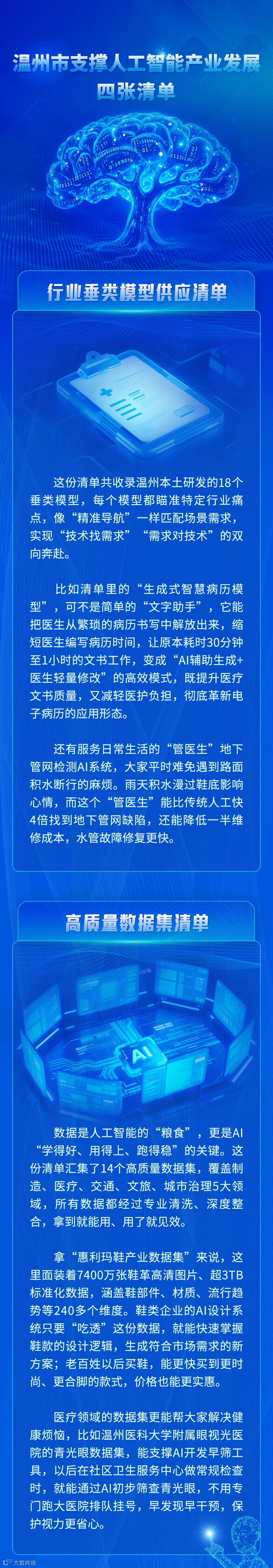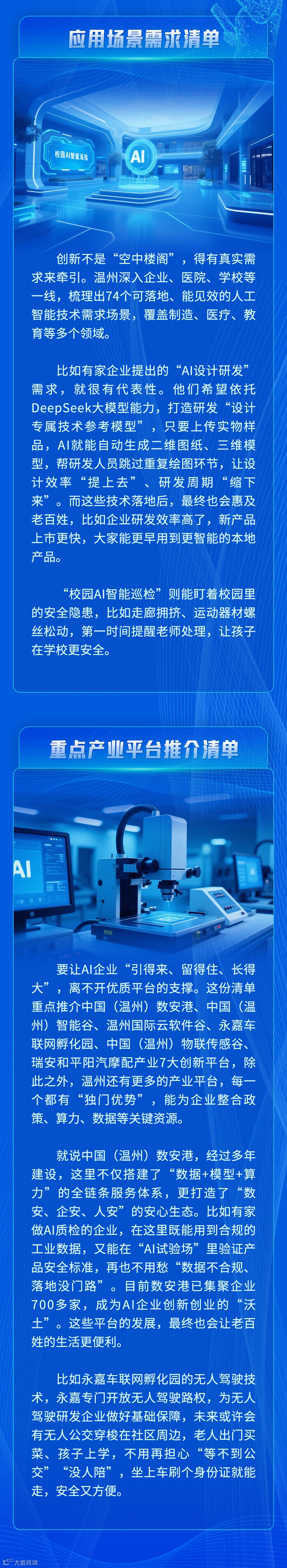 (五)温州拥有AI应用场景的优势。作为冲刺千万级人口、万亿级GDP的大市,“5+5+N”现代产业集群全链条延伸,低空经济、医疗健康、交通物流等场景资源丰富。目前,温州已在鞋履、电气、医疗影像等领域打造多个垂类大模型,加快打造“AI示范应用第一城”。
