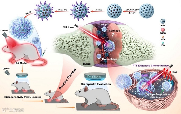 研究团队通过模板法合成了Cr3+和Y3+共掺杂的稀土长余辉纳米材料Zn1.3Ga1.4Sn0.3O4:Cr3+Y3+,将临床药物甲氨蝶呤(MTX)和近红外光响应分子吲哚菁绿(ICG)包载于纳米材料中,同时赋予该材料靶向释药能力,将其成功构建为一种具有NIR/pH双响应响应释药机制的靶向纳米诊疗探针。在佐剂诱导的RA小鼠模型中,该诊疗探针能够有效靶向到RA病变部位,并对其进行高灵敏度成像,同时基于这种高特异性、高灵敏度余辉成像模式指导的精准治疗,实现了对类风湿性关节炎的高效治疗。