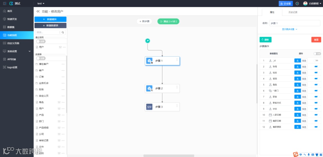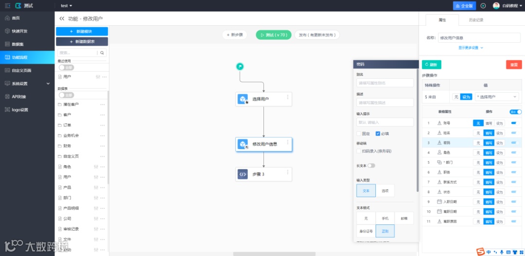 在创建账号的同时填写除系统字段外的信息:用户管理页面在添加子用户时无法配置除账号、密码、昵称、角色以外的其他附加信息。使用功能流程搭建实现用户管理的功能后,可以实现在创建账号的同时添加其他需要的用户信息,例如部门、职务等,无需再创建一个用户信息表进行记录。