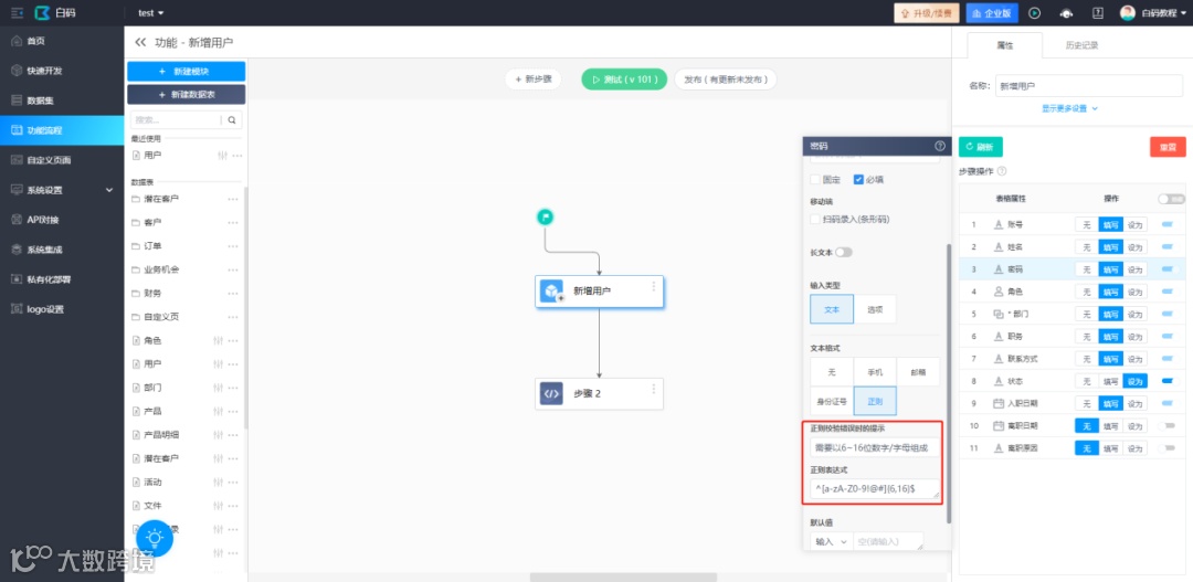 2.添加一个关联获取用户数据步骤,配置相关字段的必填选项以及正则表达式。