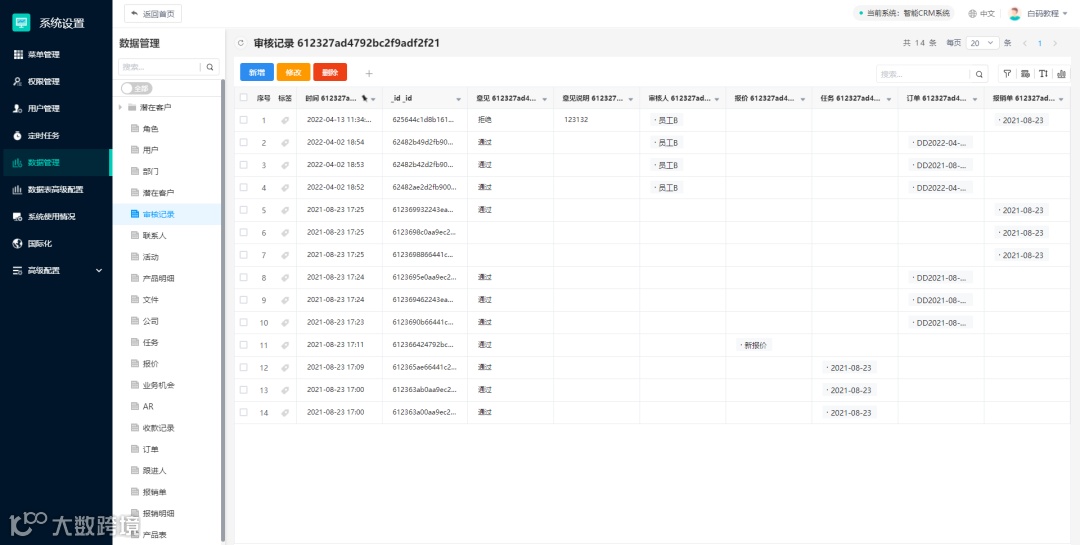 系统管理员在用户端的“系统设置”中可操作后台数据库的数据(新增、修改、删除),方便系统管理员在测试和维护时跳过业务流程直接管理系统数据。此功能需要开启调试模式才可使用。