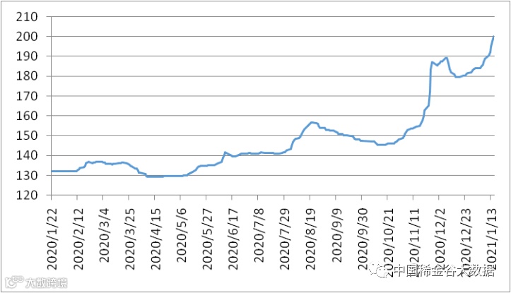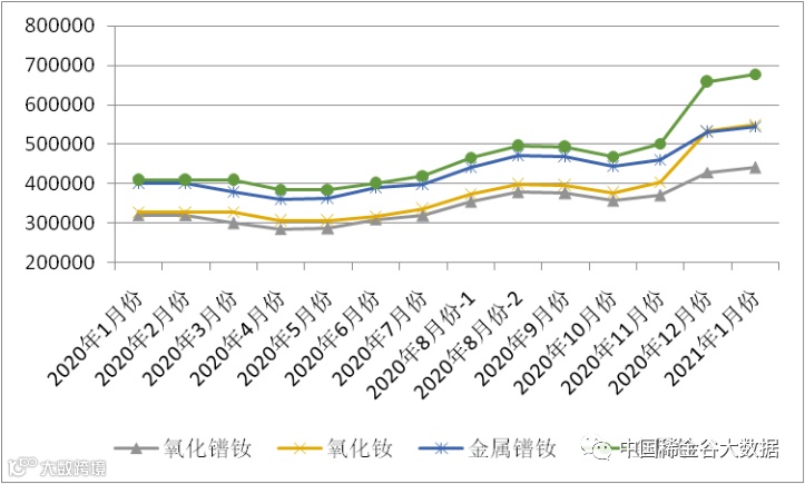 图1 镨钕系轻稀土挂牌价格走势图(202001-202101)