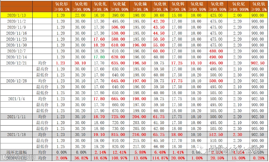与去年12月份挂牌价格相比:镧、铈氧化物价格不变,镨、钕系金属及氧化物价格均上涨。具体如下: