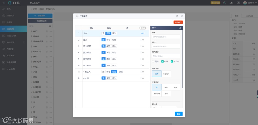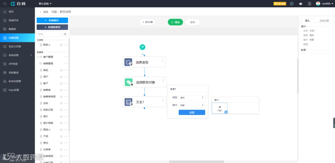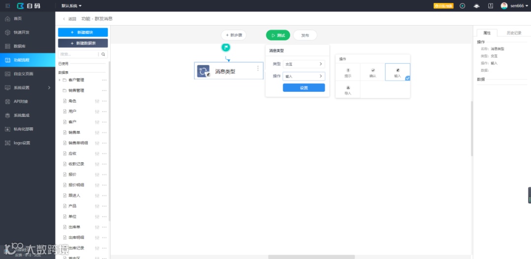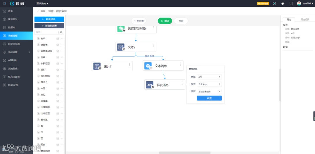 白码平台上可通过API对接使用企业微信官网的接口实现群发消息功能,正好,平台也提供了封装好的企业微信API,直接就能调用了,如果需要通过第三方应用对接企业微信API,就需要企业微信后台创建一个应用,但平台已经提供了自动集成的功能,集成后就可以直接使用平台提供的第三方类型企业微信API。