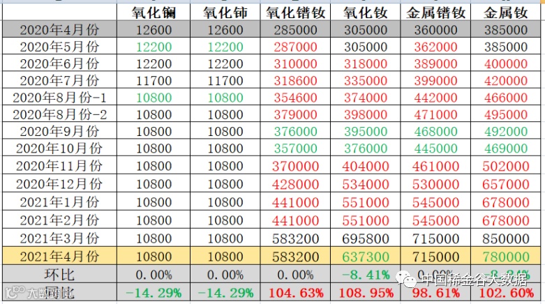 与3月份挂牌价格相比,氧化钕、金属钕价格环比弱势下降,其它挂牌价格不变。