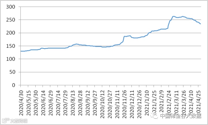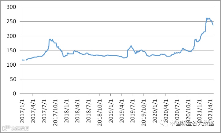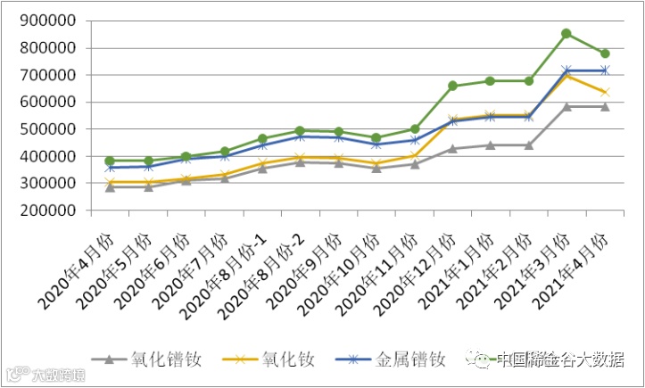 图1 镨钕系轻稀土挂牌价格走势图(202004-202104)