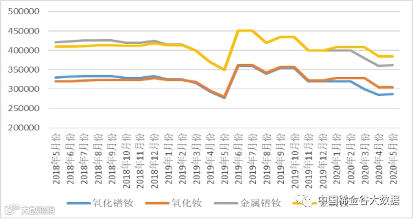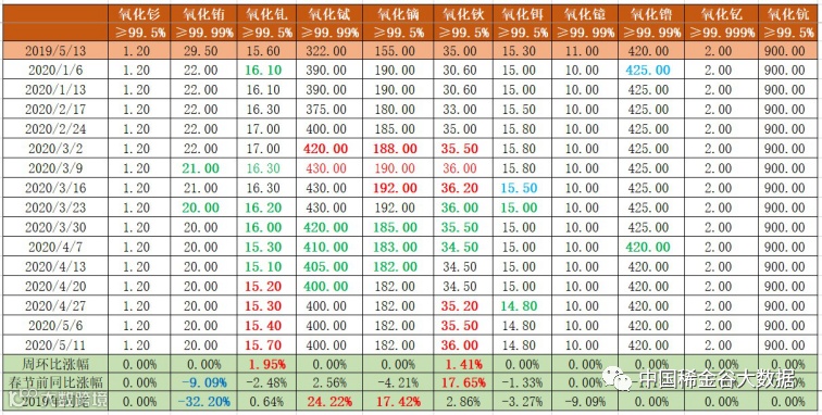 与2020年4月相比:镨钕氧化物及金属价格上涨;氧化镧、氧化铈价格下降;钕金属及其氧化物价格不变。