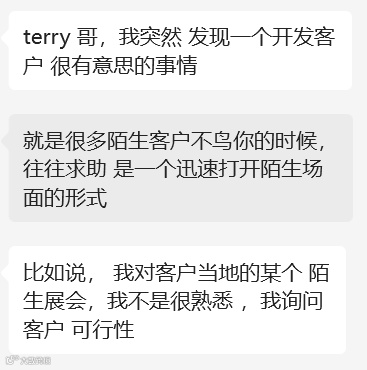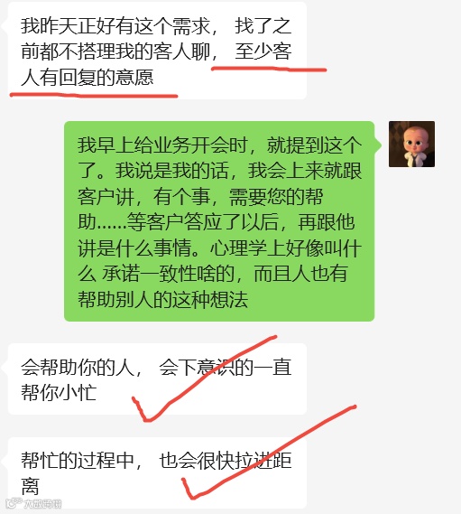 我教业务员,也会这么教。上来也别急哄哄的,去麻烦客户这了那了……拆分出来2部分,第一部分就一句户: 需要您帮个小忙……接着你再去说你的小忙是啥。