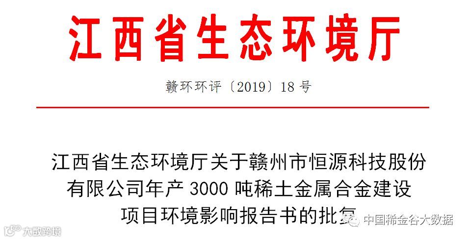 你公司《关于请求审批<赣州市恒源科技股份有限公司年产3000吨稀土金属合金建设项目环境影响报告书>的请示》(恒源环评〔2019〕01号)及相关报批文件收悉。经研究,批复如下: