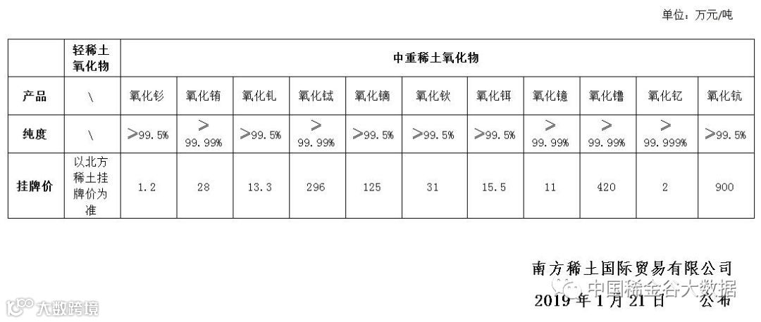 中国南方稀土集团2019年1月21日稀土氧化物挂牌价