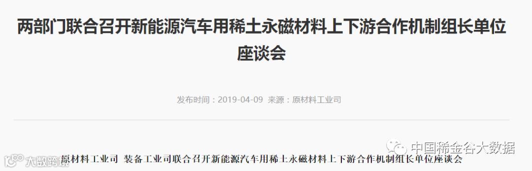 2019年4月3日,为进一步发挥好新能源汽车驱动电机用稀土永磁材料上下游合作机制作用,促进永磁材料、驱动电机、新能源整车企业间在新品开发、成果共享、标准制定等方面的协作,工业和信息化部原材料工业司联合装备工业司组织召开合作机制组长单位座谈会。