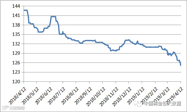 本周有五个交易日,稀土价格指数分别为126.6、126.7、126.1、126.1、125.1,本周价格较为平稳,小幅波动。稀土价格指数年度走势及近四年同期价格走势见20180412-20190412区间稀土价格指数走势图及2016-2019年稀土价格指数同期走势图。
