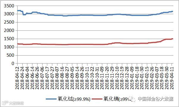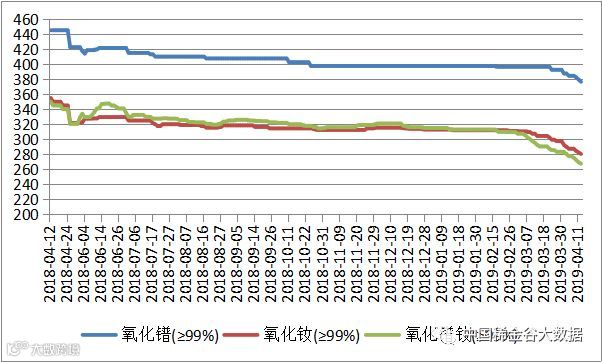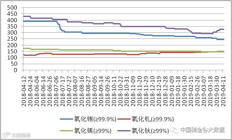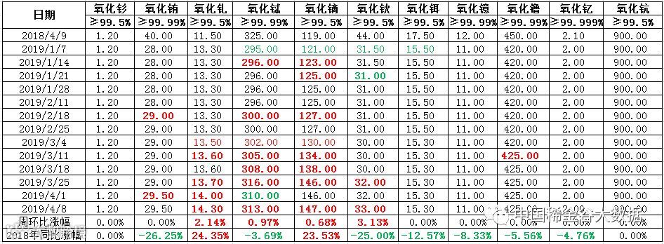 与2018年4月9日挂牌价同比分析,氧化钐、氧化钪价格不变,氧化钆、氧化镝价格上涨,其它几种氧化物价格均下降,部份跌幅较大。