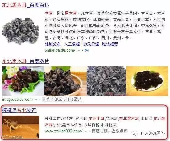 2、“东北黑木耳”这个指数200左右,以前我特别想做成却没上首页的词,现在百度第3,首页还有一个我网站的内页,前两名是百度百科和百度图片,和两个竞价页,当年竞争的其他网站也排到了后面。