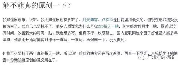 2、把精力好好的放在网站的架构和内容上,自己想把网站做成一个什么核心内容,规划好,然后开枝散叶。说到内容又要联系到伪原创和原创,即使你参考网上资料或转载别人的文章也没关系,那就做个功能站,用户进了网站有很好的入口,有社交、有互动。但我更喜欢做原创的内容,时间久了其实总有自己的经验和体会,网站规划的好,倾注了心血在里面,自然有的写。SEO方面我总喜欢看卢松松博客和zac的每日一贴,看看zac文章《SEO每天都应该干点什么?》关于原创是如何说的: