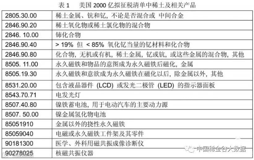 在最新公布的3290-F8号文件征税清单目录中,几乎涵盖了所有的稀土氧化物、化合物、金属和稀土永磁体,以及稀土的应用终端产品(见表1)。