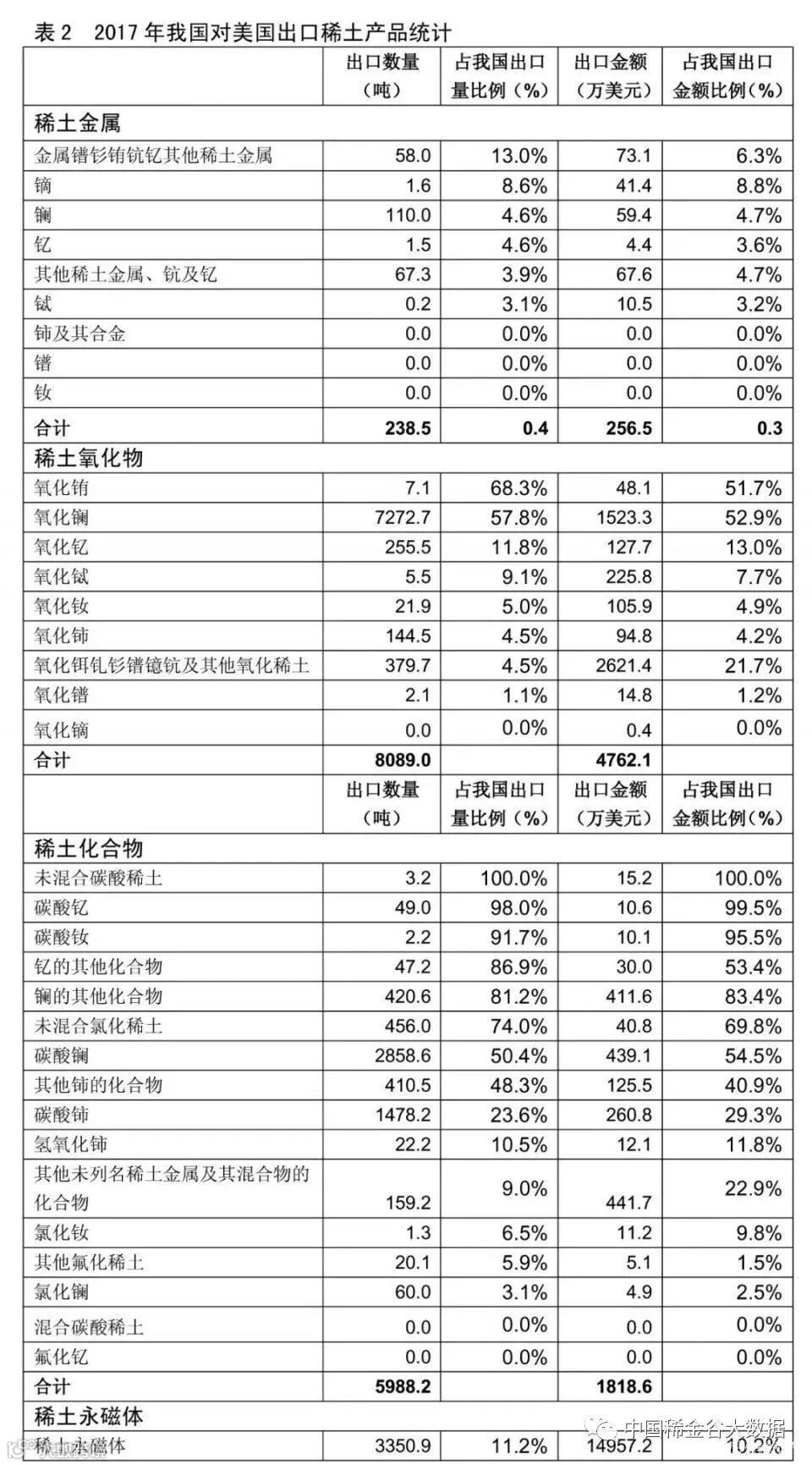 从中国海关数据显示,2017年,从数量上看,中国对美国出口稀土冶炼分离产品1.43万吨,占我国稀土冶炼分离产品出口总量的27.7%。其中,对美出口稀土金属238.5吨,占我国稀土金属出口总量的4.3%,占美国稀土金属进口总量的46%,进口品种以镧为主;对美出口稀土氧化物8089吨,占我国稀土氧化物出口总量的29.6%,占美国稀土氧化物进口总量的90%,进口品种以氧化镧为主;对美出口稀土化合物5988吨,占我国稀土化合物出口总量的31.8%,进口品种以碳酸镧为主。2017年美国总计从我国进口镧、氧化镧和碳酸镧1.02万吨,占其冶炼分离产品进口总量的71.5%。从金额上看,2017年,我国对美国出口稀土冶炼分离产品的金额6837.2万美元,占我国稀土冶炼分离产品出口总金额的16.4%。此外,2017年,我国对美国出口稀土永磁材料3350.85吨,占我国稀土永磁材料出口总量的11.2%;出口金额近1.5亿美元,占我国稀土永磁材料出口总额的10.2%。