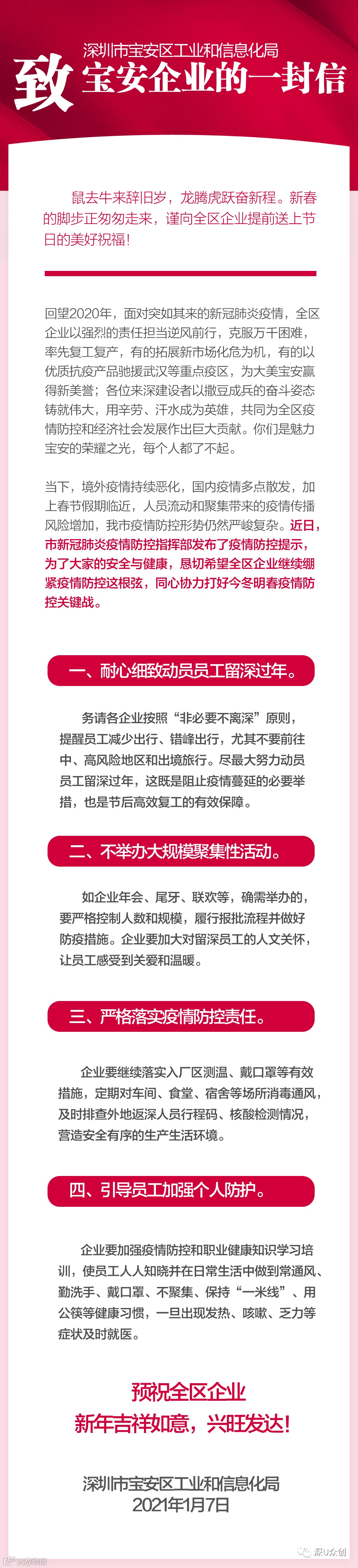 昨日,宝安区工信局发出《致宝安企业的一封信》,恳切希望全区企业继续绷紧疫情防控这根弦,同心协力打好这场战役。