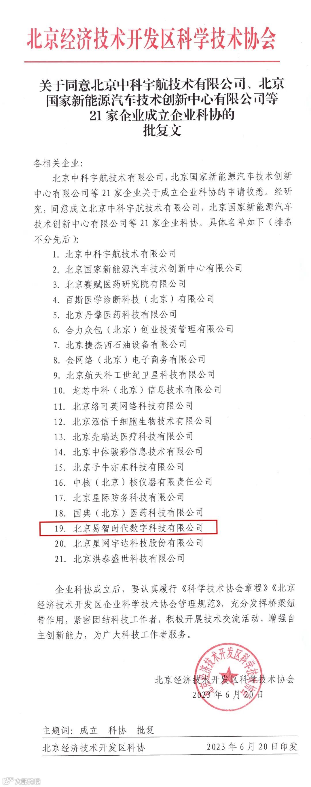 6月20日,经北京经济技术开发区科学技术协会批复,北京易智时代数字科技有限公司(以下简称:易智时代)科学技术协会正式成立。