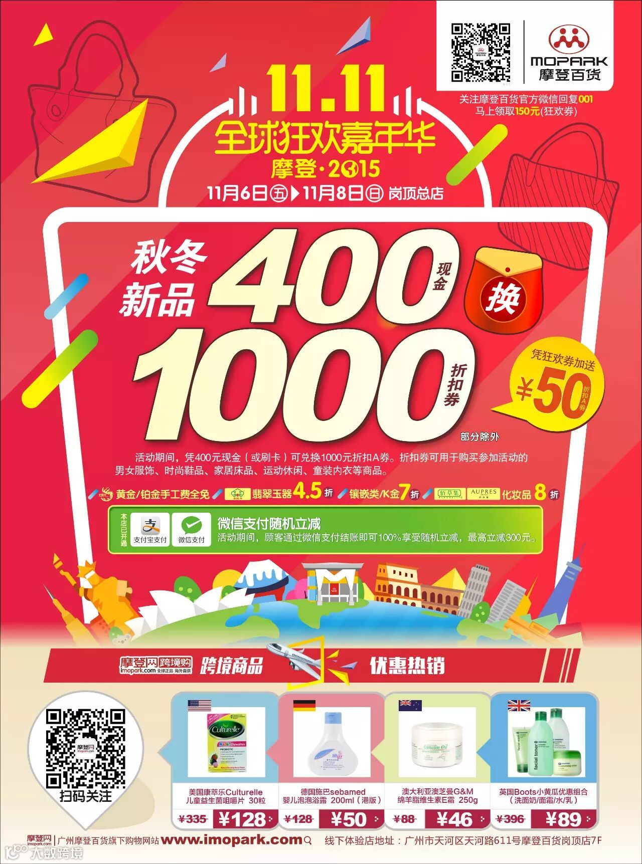 只要你用中经汇通卡在摩登百货岗顶店(11月6日-11月8日)、海购店、黄埔店、圣地店、花都店(11月6日-11月12日)消费满400元