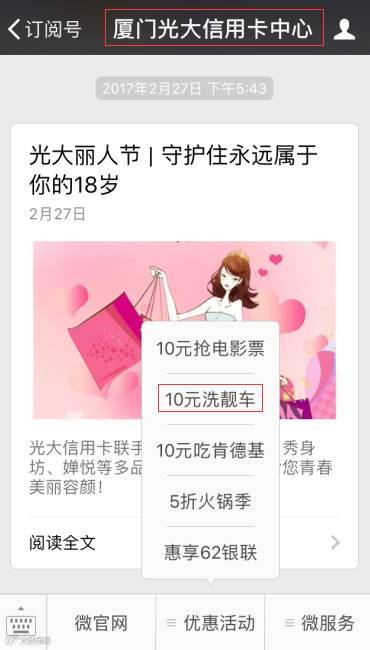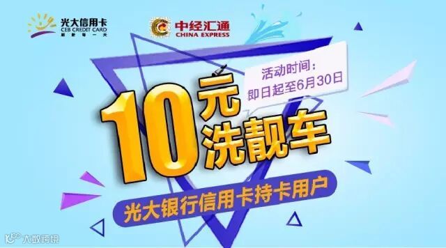 活动内容:光大银行持卡人关注"厦门光大信用卡中心"官方微信,点击底部菜单栏【优惠活动-10元洗车】,进入活动链接即可参与光大银行信用卡10元购买由中经汇通提供的厦门地区电子洗车券活动。