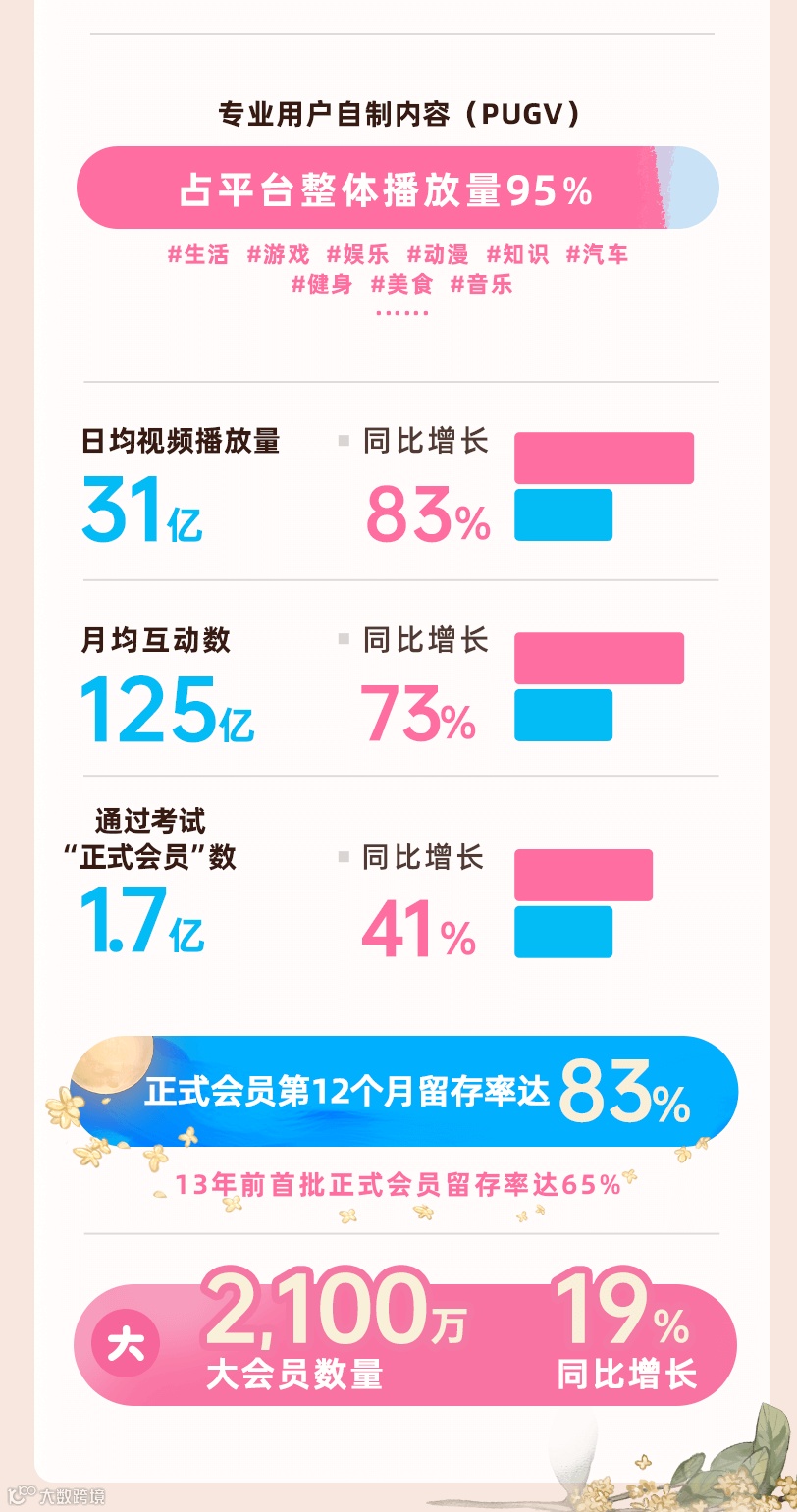 截至二季度末,通过100道社区考试答题的正式会员数量同比增长41%达到1.7亿,第十二个月留存率达83%,13年前首批通过社区考试的正式会员留存率仍高达65%,体现出用户对B站社区的长期归属感。