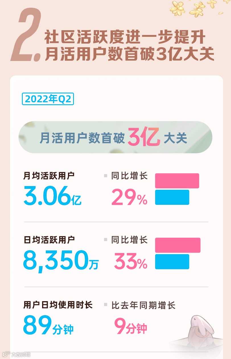 2022年第二季度,B站月均活跃用户数达3.06亿,同比增长29%,日均活跃用户数达8,350万,同比增长33%。日活用户与月活用户比例从去年同期的26.4%增至27.3%,社区粘性不断提升。
