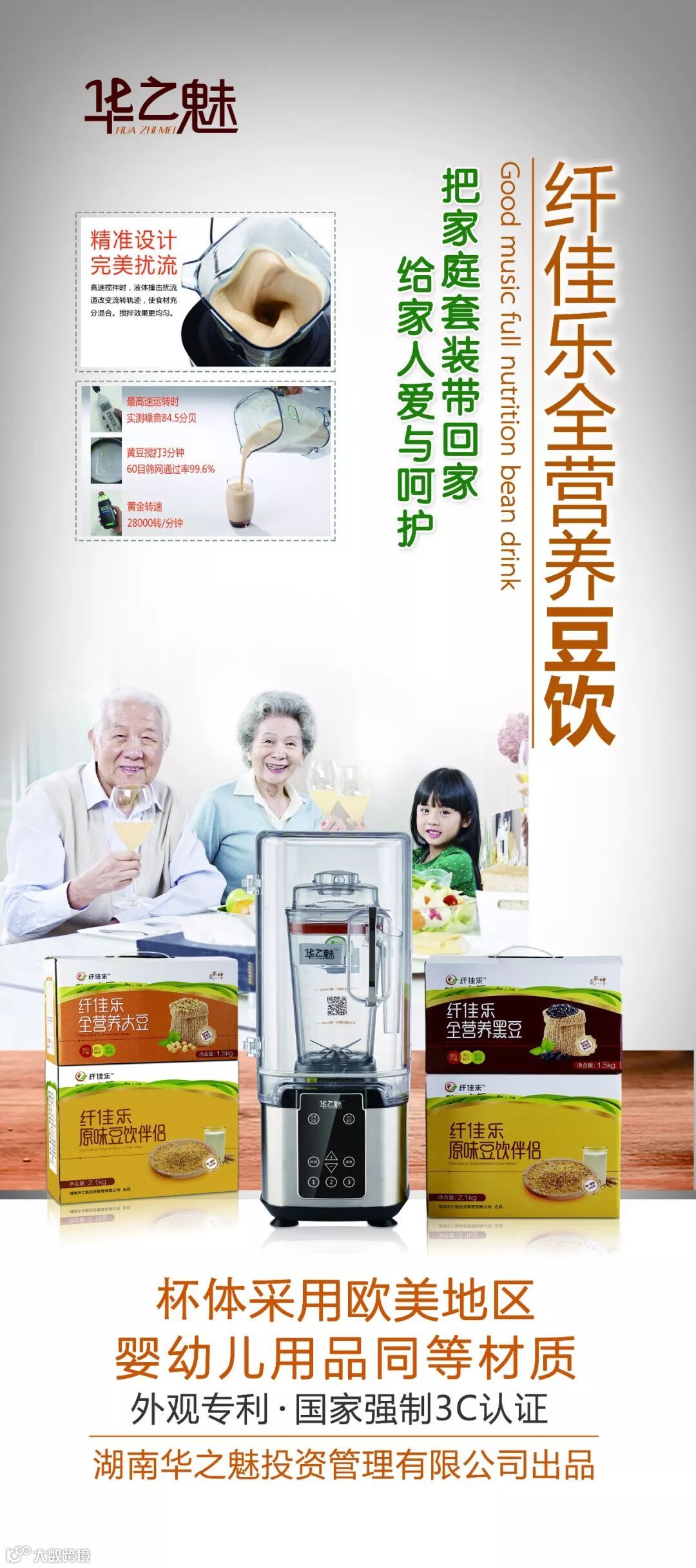 谈到豆浆,让我们来了解一下,荣获国家发明专利技术的—— 纤佳乐全营养豆浆,香浓可口,没有豆腥味,不用煮,不用泡,3-5分钟即可现榨出一家人喝豆浆的量。