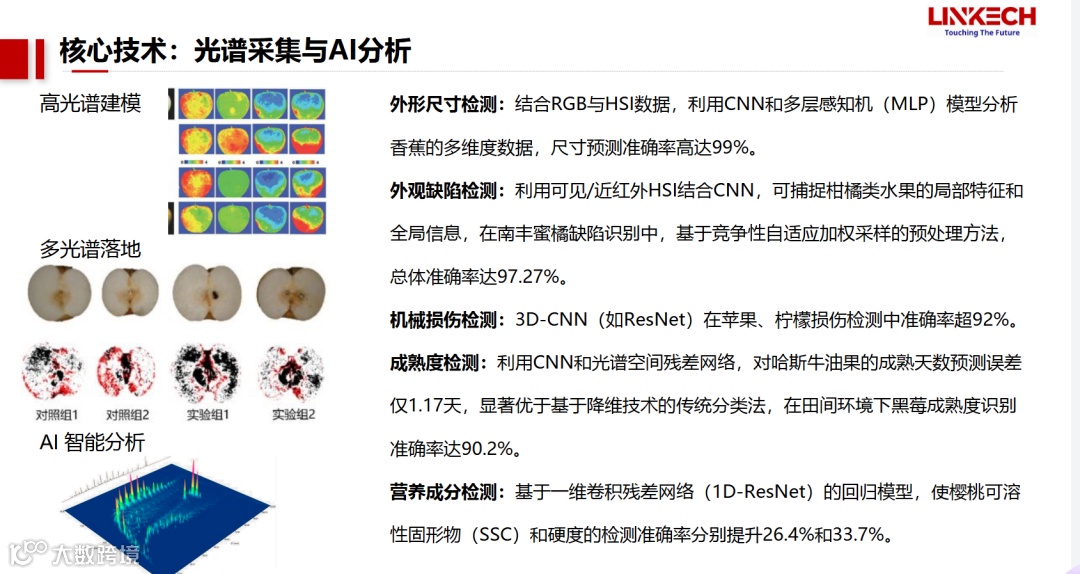 采用多光谱成像(400-1700nm)、3D 点云建模及轻量化 AI 算法(改进 YOLOv7),同步检测外观瑕疵与内部品质(糖度误差 ±0.8 Brix),分选准确率超 98%,损伤率 < 0.2%,效率达 3000 个 / 小时。 - 团队专业