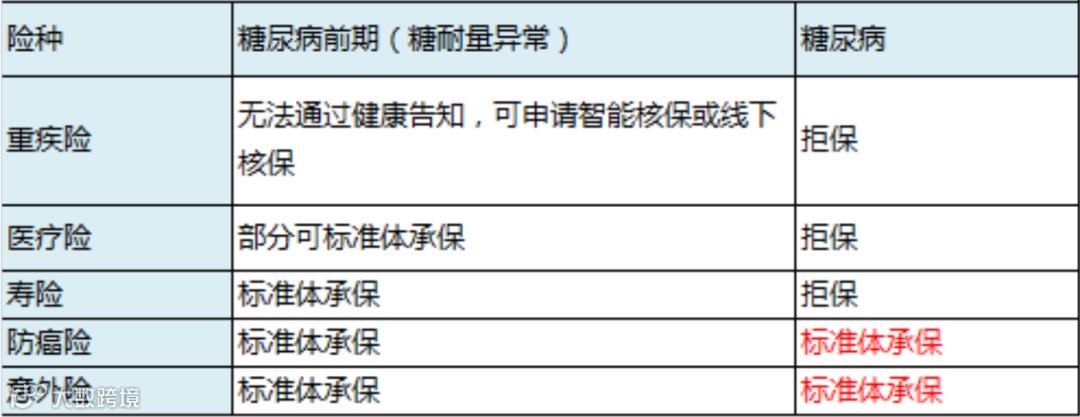 重疾险和医疗险,糖尿病是直接拒保,如果只是糖耐量异常,无法直接通过健康告知,需要智能核保或人工核保,不同产品处理结果不同。或者投保专门针对高血压糖尿病患者的产品也是可以的。