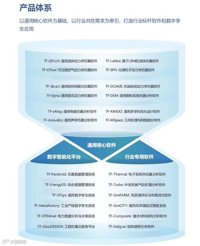 产品体系: 构建了“核心通用软件”、“行业专用软件”、“数字智能化平台”三层产品体系,已发布覆盖流体、结构、传热、声学、电磁等领域的近20款仿真与优化产品。