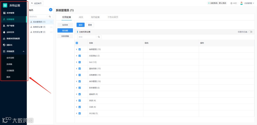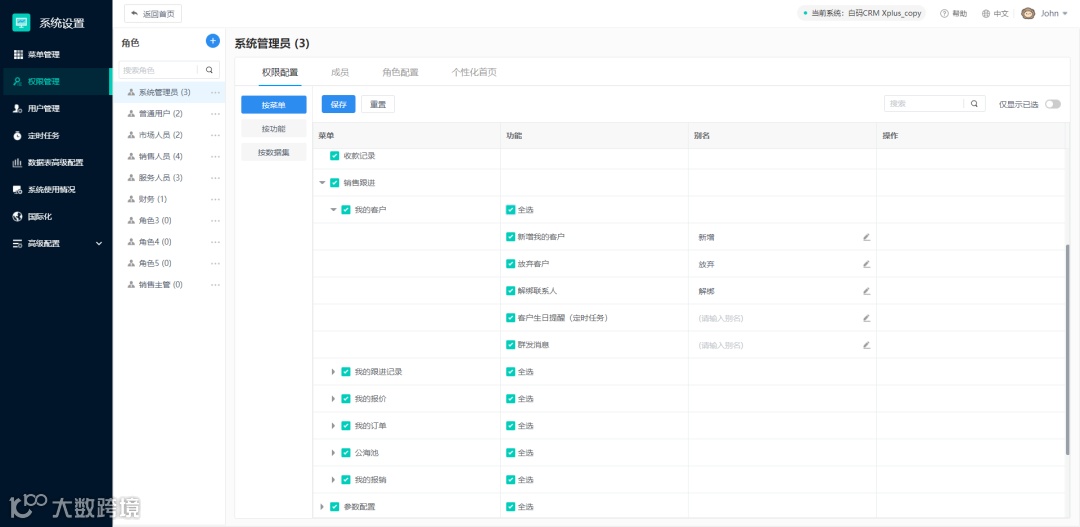 所有功能通过列表的形式进行展现,可配置功能别名以及角色权限