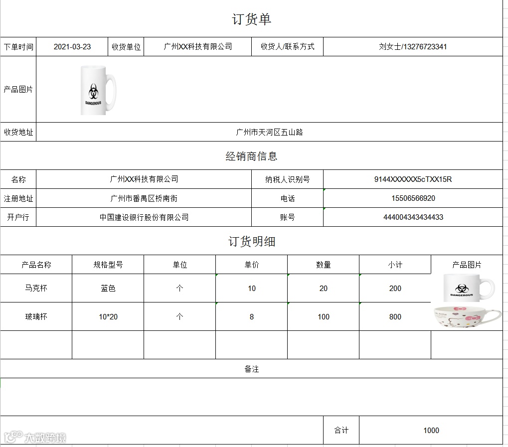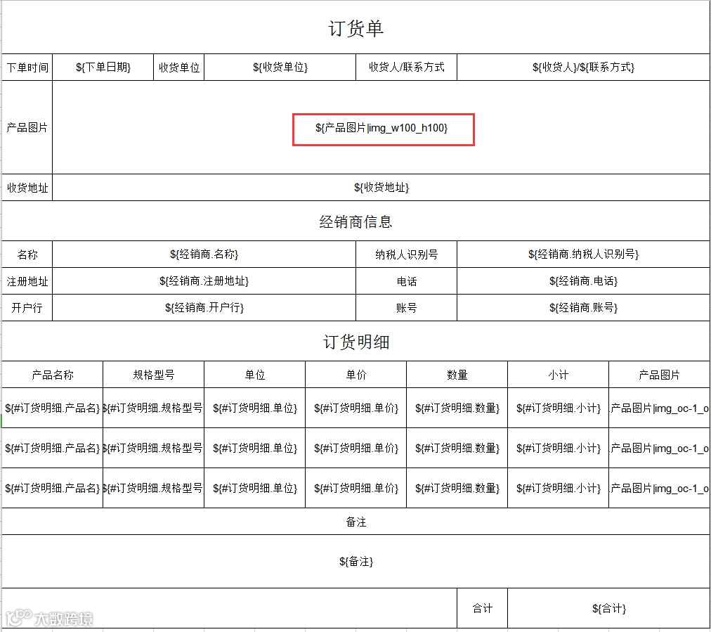 根据EXCEL中的变量填写标记(格式参照标记格式表),订货单模板如下图: