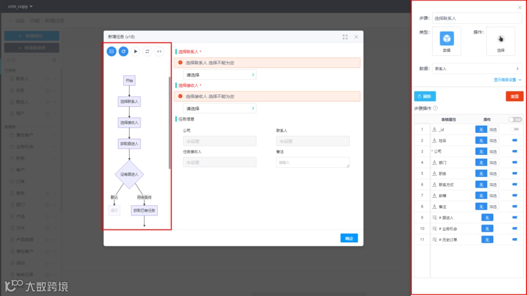 点击该流程图中的一个步骤可在右侧显示一个窗口,该窗口用于显示该步骤的各项信息,并且可在该窗口直接修改步骤操作、表格属性、是否隐藏等信息,而不需要进入功能构建页面中的步骤设置页面进行修改,从而提升效率。