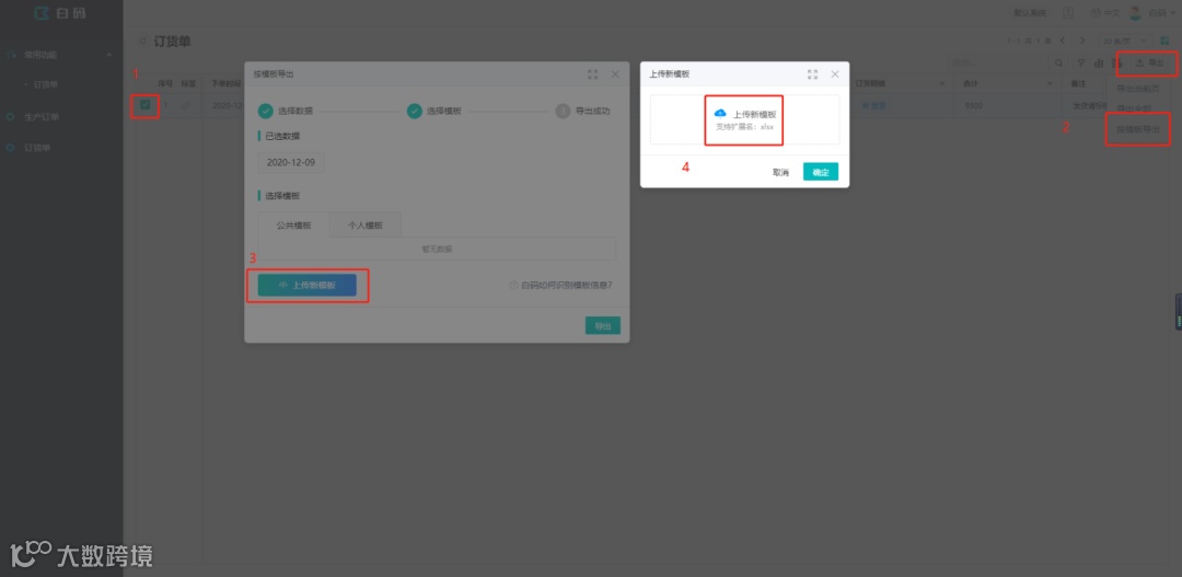 在订货单列表,勾选一条数据,点击右上方的导出——按模板导出,第一次进行导出需要上传一个模板,选择已制作好的模板上传即可。