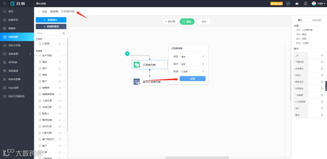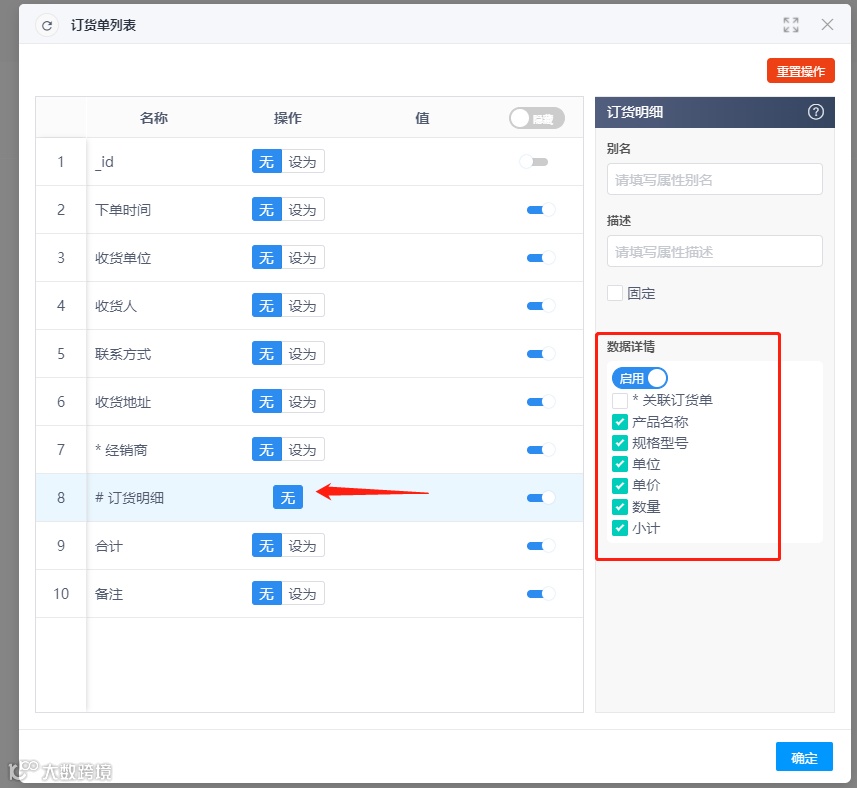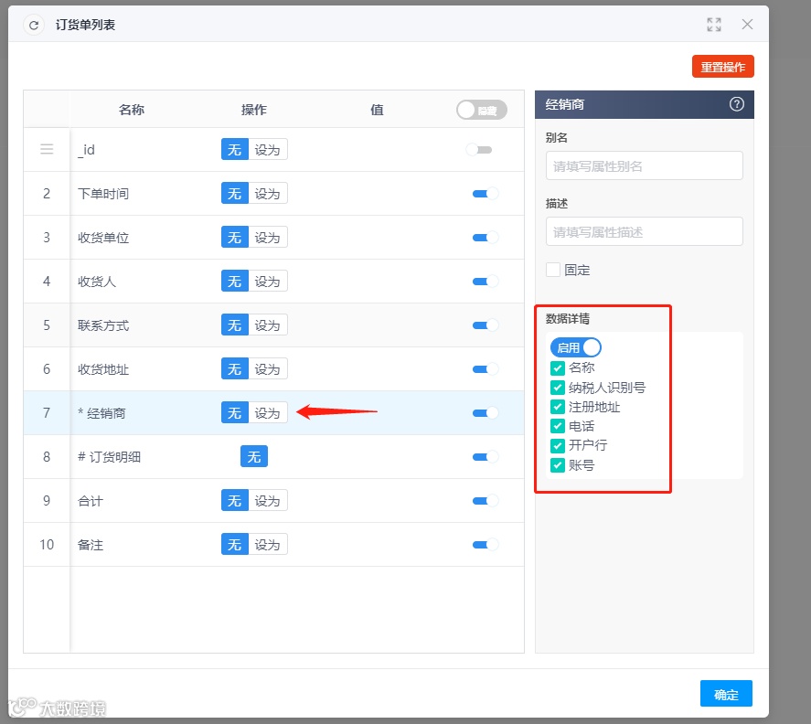 1.导出的Excel中的经销商信息是来自关联对象的,以及订货明细的数据也是来自集合的,所以需要先在订货单数据集配置这两个属性的“数据详情”并重新发布数据集,如图所示;