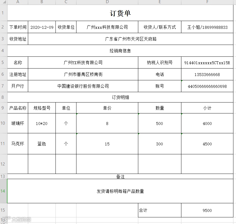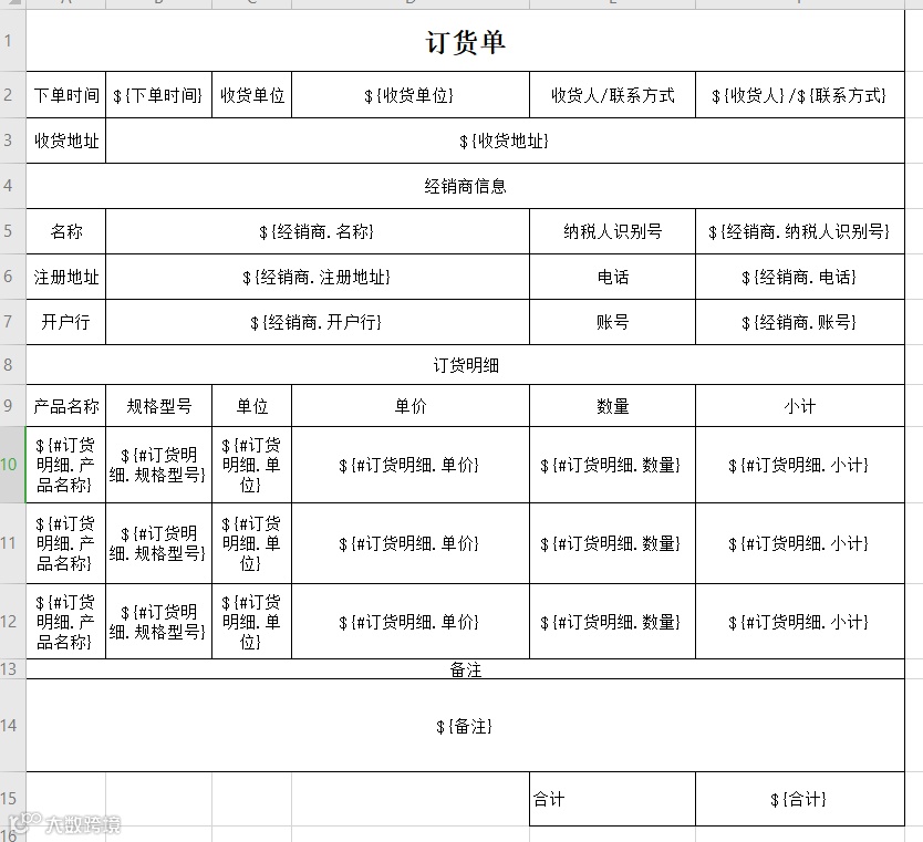 将白码系统中的一个订货单数据按照下图格式导出一个Excel;