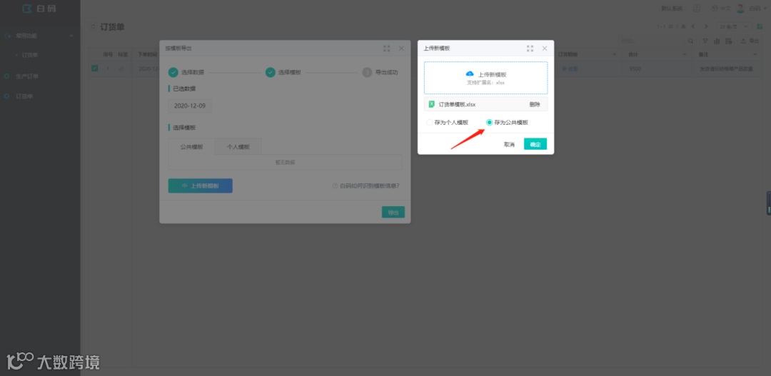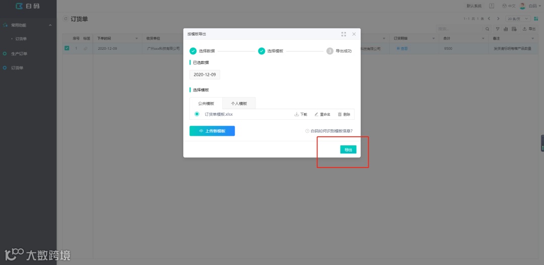 回到用户端,在订货单列表,勾选一条数据,点击右上方的导出——按模板导出,第一次使用需要上传一个模板,就选择上一步准备好的模板即可;