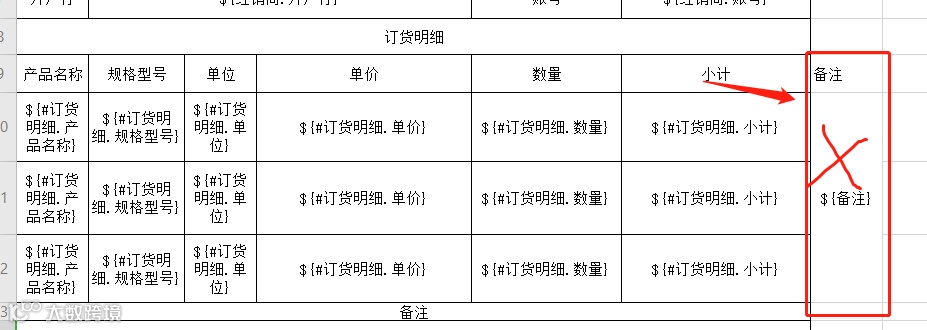 3.如需导出列表样式(如上图的订货明细),请添加足够多的行数,如上图只有三行,则导出时最多只会导出三行数据,不支持列表左侧和右侧添加标记,如下图所示;