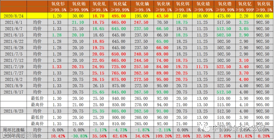 与2020年8月24日挂牌价同比分析,氧化铕同比下降(降幅30.8%→30.8%,降幅与上期相比,不变),其它10种氧化物均同比上涨。
