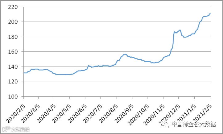 图1 镨钕系轻稀土挂牌价格走势图(202002-202102)