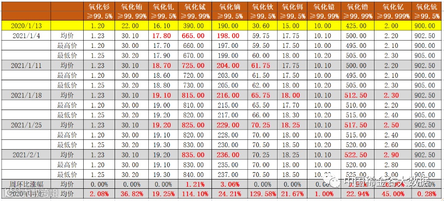 与2020年1月13日挂牌价同比分析,11种氧化物均同比上涨。氧化铕、氧化铽、氧化钬、氧化钇同比大涨,涨幅分别为36.8%、114.1%、129.6%、45.0%;氧化钆、氧化镝、氧化铒、氧化镥价格亦同比上涨,涨幅超过10%,分别为19.3%、24.2%、21.7%、22.9%;其它氧化物价格均同比涨幅小于10%。