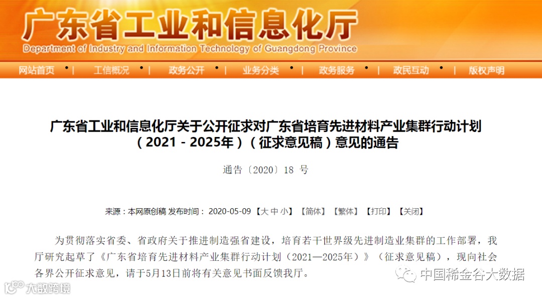 5月9日,广东省工信厅发布《广东省培育先进材料产业集群行动计划(2021—2025年)》(征求意见稿),拟加快培育稀土、钨等先进材料产业集群,促进产业迈向全球价值链中高端。