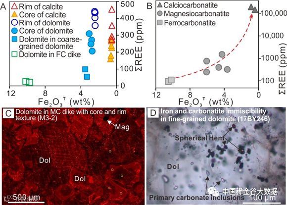 白云鄂博碳酸岩脉及碳酸岩脉中白云石、方解石矿物的铁及稀土含量关系图