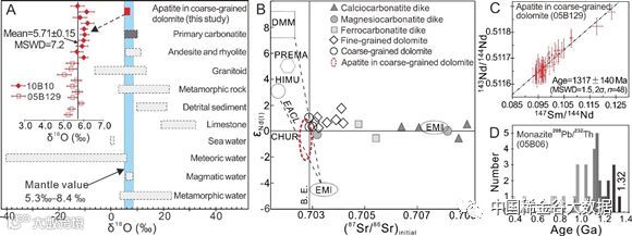 中国科学院地质与地球物理研究所矿产资源研究重点实验室副研究员杨奎锋和研究员范宏瑞等,对白云鄂博地区粗粒含矿白云岩中的磷灰石进行原位Sr-Nd-O同位素分析。磷灰石的O同位素组成与地幔来源碳酸岩一致,Sr-Nd同位素组成与碳酸岩脉相近,磷灰石的Sm-Nd等时线年龄也与钙质碳酸岩脉中独居石的Th-Pb年龄相符。结合粗粒白云岩的主量元素组成,以及磷灰石中共生的自形烧绿石矿物包裹体和球状初始碳酸盐岩包裹体,可以确定粗粒含矿白云岩为镁质岩浆碳酸岩。