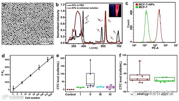 a) NaEuF4纳米粒子电镜表征图;b) 纳米粒子在磷酸盐缓冲液与增强液中的发射光谱与紫外灯照射下的发光照片;c) MCF-7乳腺癌细胞与纳米探针结合前后的流式细胞分析;d)时间分辨荧光信号与CTC浓度的线性关系;e)不同分期乳腺癌患者的血液CTC箱式统计分析图;f)基于稀土纳米探针与商用ISET检出的CTC水平比较。